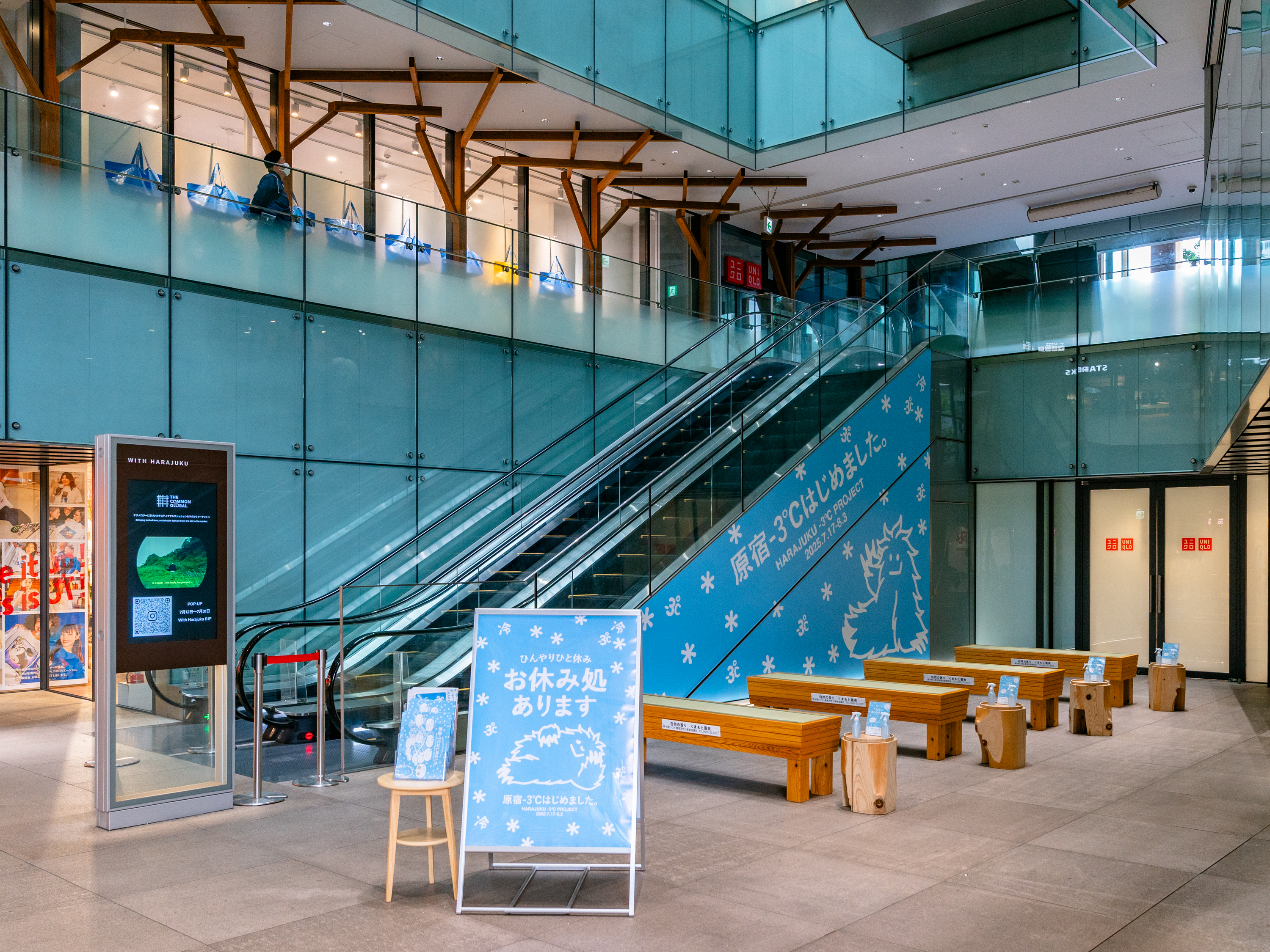 館内装飾を水色で統一。館内をB1Fスペース・ストリートでは畳ベンチ、館全体に冷やし商品を設置し、五感で「涼」を体感できる空間を演出しました。